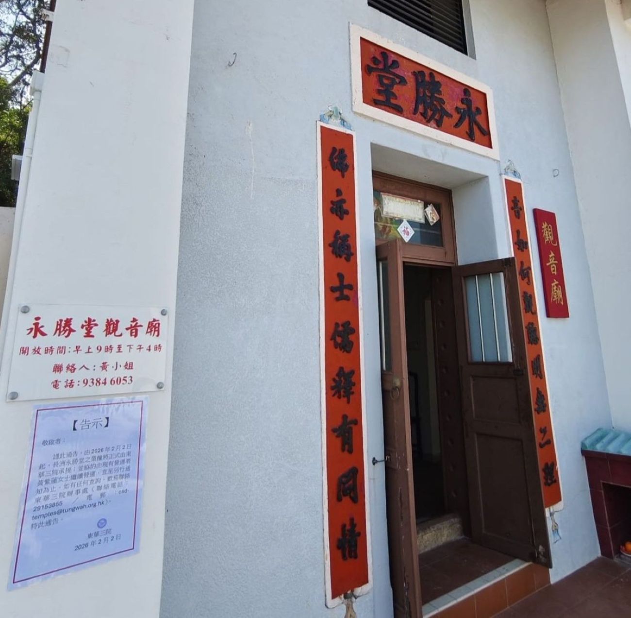 长洲永胜堂位于长洲西湾,由罗昌康女士及女道士杜昌兴于1925 年兴建,寺堂主要供奉观音。由2026年2月2日起,其业权正式由东华三院承接。2010年获评为三级历史建筑。