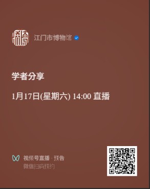 當日講座將於江門市博物館的微信公眾號上直播,歡迎使用微信掃描以下二維碼預約觀看。 館方亦會錄製講座,稍後將上載到本網頁讓公眾網上重溫。